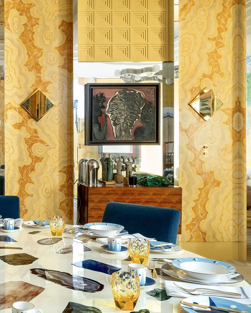 “Furniture was low: coffee tables, sofas and soft, textural carpets that invite you to kick your shoes off and relax,” says Ghoniem. “Soft furnishings were voluptuous and fabrics were super tactile, from velvet to chenille. The ’70s is also defined by lots of solid timber pieces. Color confidence was much freer then, with patterned wallpapers and printed fabrics used for window treatments, too. All these stimulating elements indulgently feed the soul.”