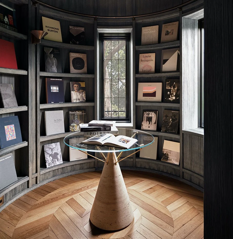 A glamorous Toronto home designed in 2023 by leading American interior designer Kelly Wearstler also offers a small library as a place of escape. Like a castle turret, this dramatic wood-paneled room has a circular plan where shallow bookshelves sit between slot windows. The family’s large-format books are the crowning glory here; the front covers face outward, displayed as they might be on the shelves of a shop, allowing their designs to be fully admired. Instead of a chair, a glass table in the center of the room is the place to leaf through anything that takes the reader’s fancy.
